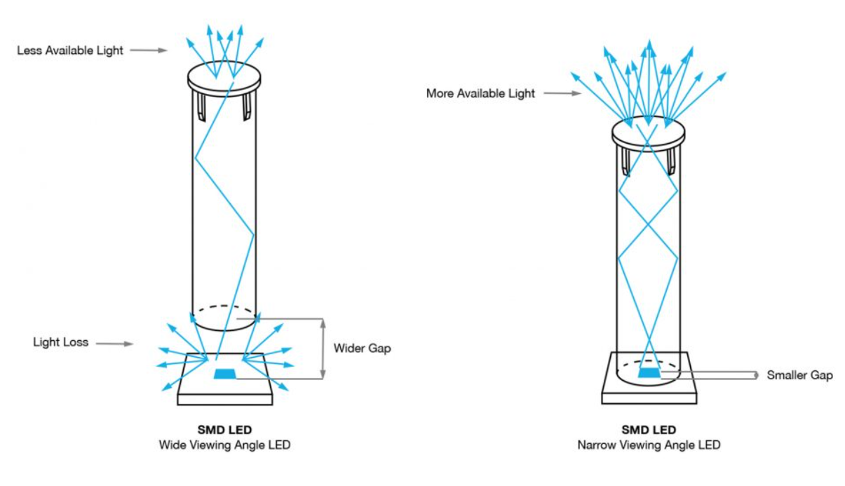 A general guideline is to use an LED with a narrow viewing angle of 160 degrees or less and make sure there’s no more than 0.05” between the LED and the light pipe position.