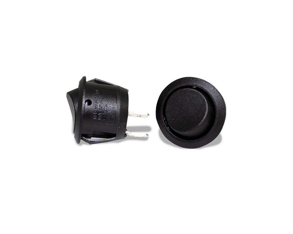 Rocker switch black round actuator 2P SPST 20.2mm diameter Off-On 20A 14VDC, 10A 28VDC, 16A 125VAC, 10A 250VAC .187″ QC